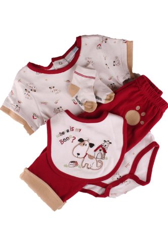 The adorable 4 pc red and tan baby boys pant set features a cute little doggy print on the short sleeved onesie. An adorable embroidered doggy applique is featured on the matching little where is my bone bib. The set comes complete with elastic waist red and tan pants with an adorable paw print on the back of the pants. The outfit finishes with the matching white and tan trimmed socks. Read more...
