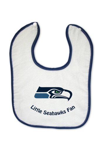 Seattle Seahawks Baby Bib. Licensed NFL Baby Bib with Team Color Trim. 86% Cotton, 14% Polyester. Adjustable Snap. Washable, Tumble Dry. Read more...
