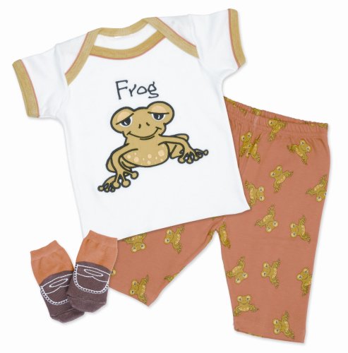 From the ManufacturerThis Mud Pie Baby Animal Crackers Frog Playset with Socks comes with 3 pieces: appliqué tee, printed pants, matching loafer socks. It is 100% cotton and machine washable, sized 0 to 6 months. Product DescriptionAre you looking for something for your baby boy that is as cute and adorable as he is? Tired of the boring old baby boy collections? Then you will love the selection of clothing and gift items in the Animal Cracker Baby Collection from Mudpie. Choose from an assortment of plush play blankets, rattles, oopsies, ceramic banks, preppy patent leather moccasins, bath time squirt toys, 100% cotton onesies and more. Each item comes in your choice of three fun romping animals, hopping frogs, grinning gators and playful dinos. This 3 piece set features applique tee and printed pants with matching loafer socks to complete the set. 0-6 months Read more...