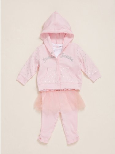 She'll be feeling pretty in pink with this dazzling set. Short sleeve shirt has metallic bear front. Long sleeve hoodie has snap button closures with metallic logo and polka dot detail. Soft leggings with tulle skirt completes the look. Three piece set. 100% Cotton Machine wash cold Baby > Baby Girl (0 - 9 m) > Outfits Read more...