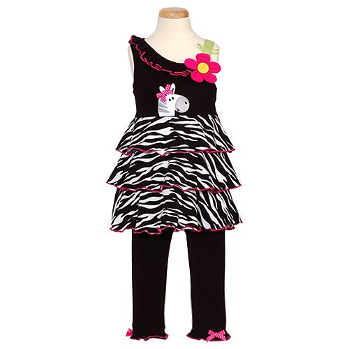 A darling outfit for your little girl from Bonnie Jean. This two-piece set features a black one-shoulder top with a ruffled neckline, red lettuce edging, a zebra applique on the front, a flower-appliqued shoulder strap and a black/white zebra-print 3-tier ruffled hem with red lettuce edging. Includes black knit leggings with contrasting bow trim on the ruffled leg hems. Read more...