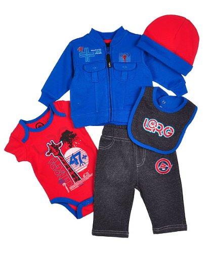 Give your little guy a winning combination with this 5-piece set from LRG. All items are made of soft jersey cotton for superior comfort. Includes: Jacket: full zip, ribbed trim, snap chest pockets, "+" logo embroidery. Bodysuit: lap collar, tagless collar interior, easy-change snaps on bottom, "Elevated Vision" giraffe graphic. Pants: denim-look material, elastic waistband, logo embroidery on front and back pockets. Bib: snap fastener, denim-look, printed logo. Cap: contrasting cuff. 100% Cotton Machine Wash Cold Made in China Read more...