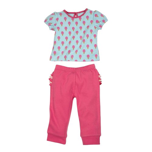 Let the world know how sweet your adorable new baby girl is. This baby clothing set mixes pink and light teal to produce a stunning visual effect. Accented by ice cream cone graphics, this tee shirt and pant set is certain to become her new favorite wardrobe choice. Sized 12 months.